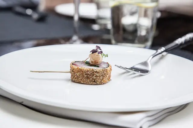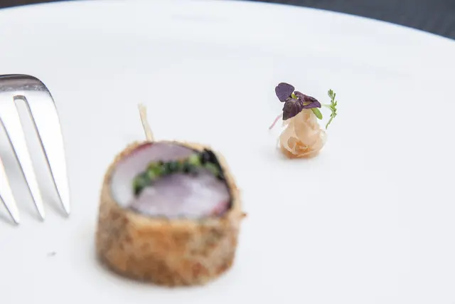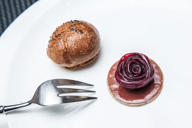 原來是玫瑰花下的基底呀,主廚將伊比利豬頰混合特製香料做成泥狀,呈現如同奶油般的柔軟質地,吃的時候可以像吃鵝肝醬一樣,將歐包頗半,先吃伊比利豬頰的部分,油脂乾香甜美,伊比利豬頰泥入口即化,還帶有伊比利豬特有的核果香,再來吃紅酒甜菜根微酸氣息一掃口中的餘味,為下一道菜做準備