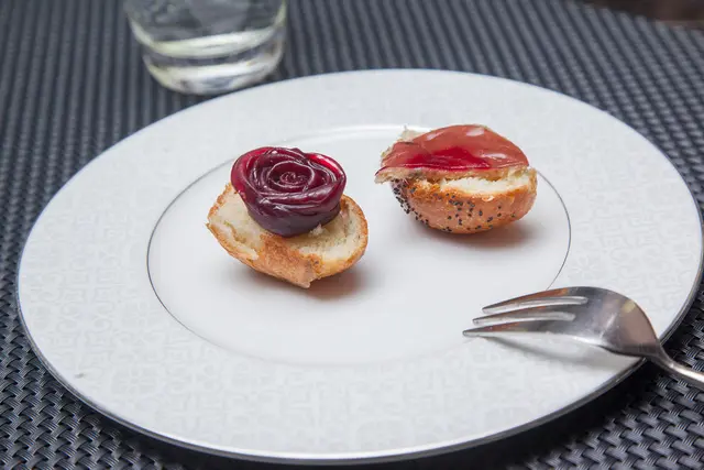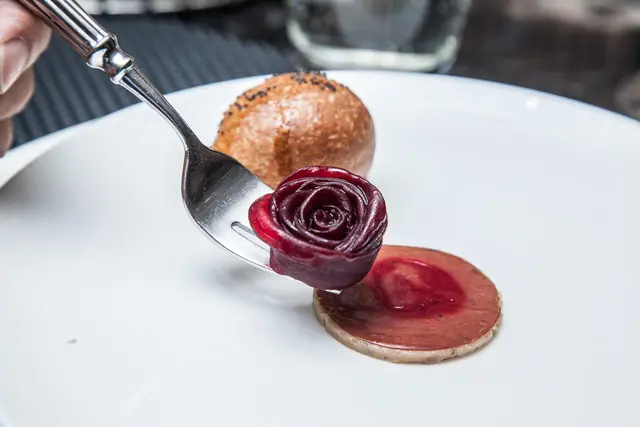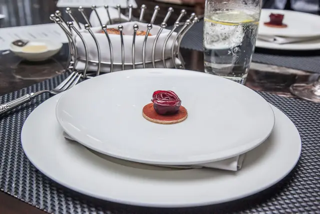 伊比利豬頰佐紅酒甜菜根同樣也是外觀美麗的一道菜餚,用紅酒醃漬的甜菜根特別做成含苞待放的玫瑰一般