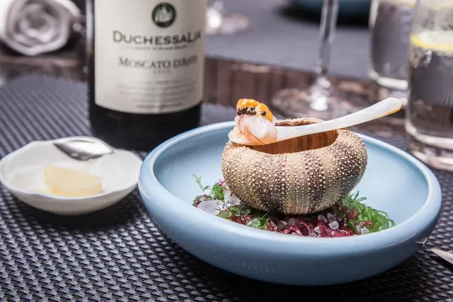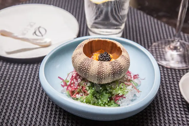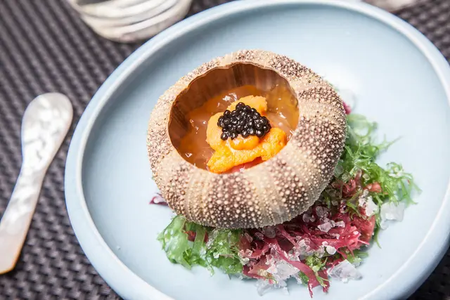 整顆海膽殼上桌噱頭十足,裡面是海膽、胭脂蝦、特製的海鮮凍,上面綴上頂級的鱘龍魚子