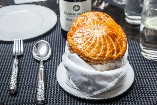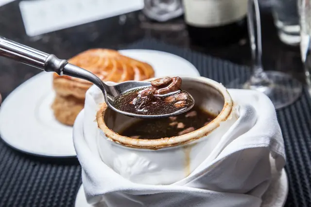 博古斯的代表作”黑松露酥皮湯”,為1974年,他特別為當時的總統季斯卡所創作的,用特別設計製作的酒杯狀湯盅,盛著法國著名的黑松露鴨肝濃湯,再覆蓋上一層奶酪酥皮,烤成一朵如香菇狀的可愛造型
