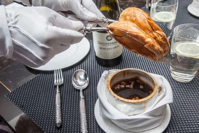 上面的酥皮就是DE LOIN德朗餐廳向博古斯所致敬,管家幫我們將酥皮的蓋子掀開,掀開之際,裡面的湯體飄著淡雅的中藥香氣