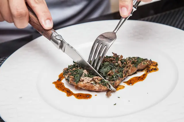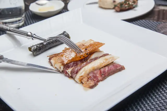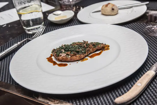 上桌時一股濃郁的肉香迎面襲來,拿起精緻的刀叉餐具,餐刀毫不拖泥帶水的劃開伊比利豬肋眼,切口透出粉嫩的色澤,一口吃下,如果是閉上眼睛,這根本是超軟嫩的肋眼牛排,肉汁滿盈肉香十足,鴨肝奶油適時補進缺乏的油脂感,讓伊比利豬吃來更加柔嫩香甜,灑上乾燥的羽衣甘藍微甘的苦味讓伊比利豬肉的核果風味更加明顯突出