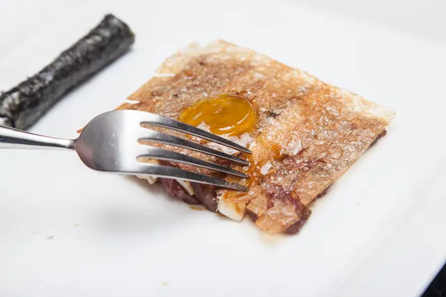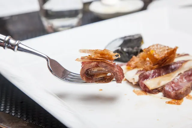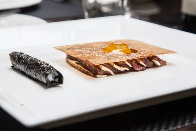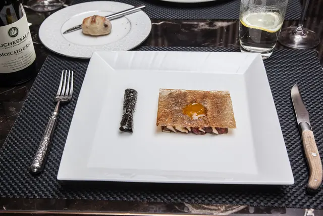 薄如紙的脆皮上面放著一顆鵪鶉蛋黃,下方的切片和牛則是和杏鮑菇層層交疊,