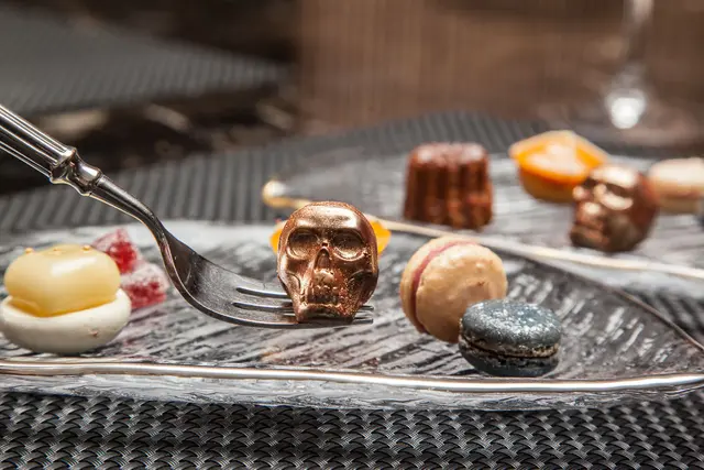 眾多甜點中最酷的就是這顆骷顱頭造型的巧克力,有著酸甜苦辣四種口感,咬咬心裡在想怎麼可能有這樣的甜點,管家說這要一口吃才有酸甜苦辣的感受,咬咬半信半疑地一口吃下,真的是酸甜苦辣的口感,而且是漸層的出現,超厲害!