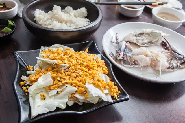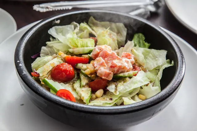 在蒸煮的同時,服務生送上了魚卵沙拉,將切塊的魚卵拌入淋上日式和風醬料的爽脆生菜,魚卵的鹹香伴著酸甜醬汁,開胃