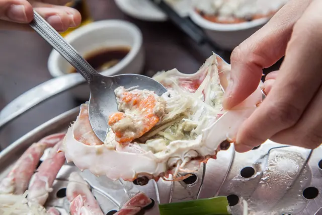 蟹肉肉質纖細飽滿,已經事先將蟹殼敲破處理,所以吃起來相當方便,一吸一咬,就可以吃到完整鮮甜的蟹肉了