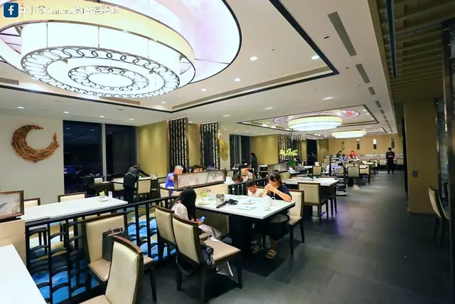 餐廳空間開闊,上方天花板精心設計成圓型燈架,牆上有充滿中國風擺飾佈置,