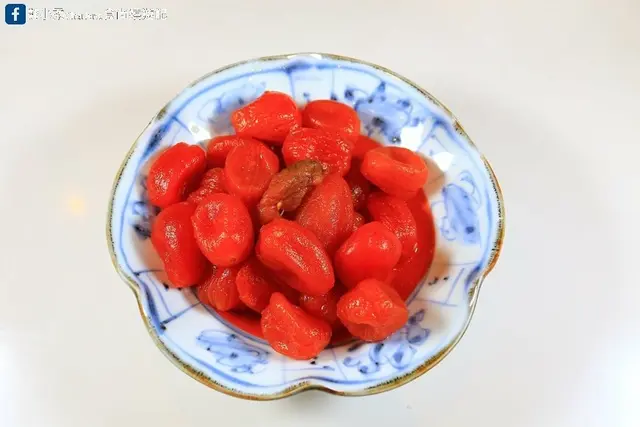 小番茄去皮浸入特調紫蘇梅汁,呈現酸甜風味,