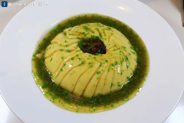 外觀令人驚豔的一道功夫菜,主廚展現精湛刀工,將嫩豆腐切成薄片,