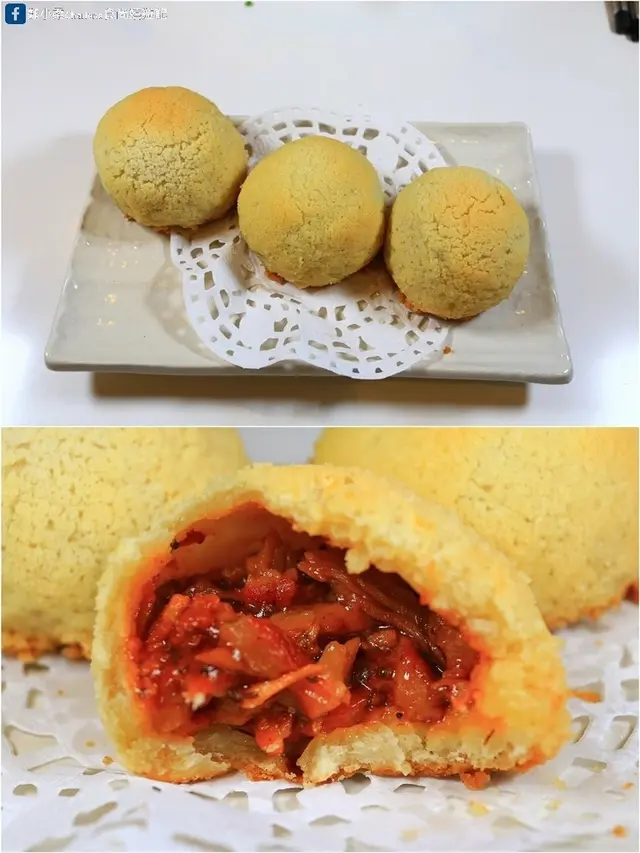 外觀是菠蘿麵包皮,嚐起來酥脆帶些軟嫩、微甜,