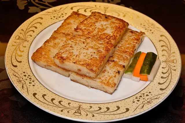 蘿蔔去皮切絲脫水, 加入火腿與蝦米等調味料, 最後烘烤出來