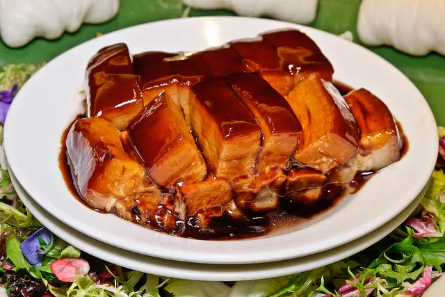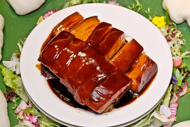 這東西首先要選好的五花肉, 肥瘦比例也要對, 然後先大火蒸煮一小時, 再用特製醬汁滷製七小時