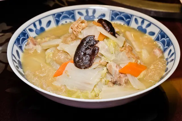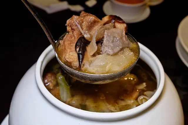 大火熬煮雞, 豬大骨, 白蘿蔔與大蒜, 再加入金華火腿, 小火熬製三小時, 取其很香的湯頭, 湯料裡有黑魚皮,香菇,豬腳丁, 土雞肉, 芋頭,栗子,干貝等