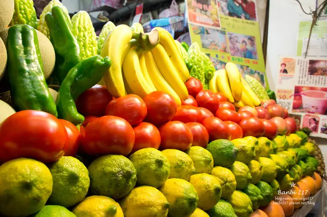 小小的果汁攤上擺放著許多水果,有葡萄柚、木瓜、蘋果、番茄、香蕉、哈密瓜、鳳梨、檸檬、苦瓜、紅蘿蔔,還有青椒耶!