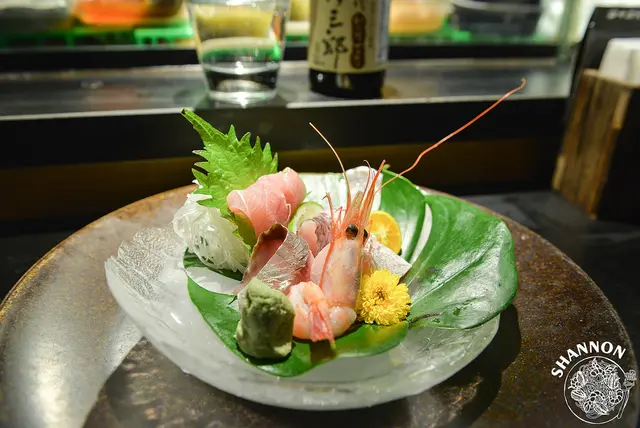 蝶魚也可以說是比目魚,不過吃起來並沒有太讓我驚豔,反而是上方的鱈魚肝讓我覺得很香,襯托了生魚片的甜度!右邊的鰹魚吃一口有很重的薑味,我個人不大喜歡!