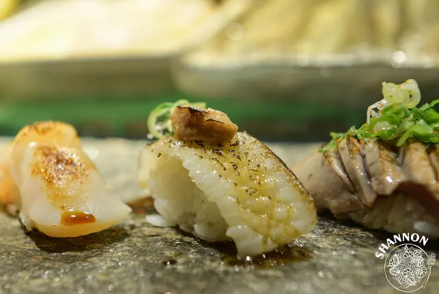 厚厚的鮭魚本身就讓我很喜歡,店家搭配上松露油說很好吃,一吃下去不得了的合拍,真的是我喜歡的香氣!!不過S不愛松露所以就無法體會這樣的感覺,右邊的干貝握壽司就少了點特色,整個被鮭魚比的下去!共通點就是都很新鮮有甜味
