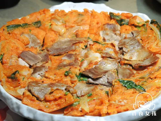看名字還以為是什麼小巧可愛料裡,沒想到端上來那麼大片!它其實就是名副其實的泡菜豬肉煎餅,口味比泡菜豆雞在重些,但比較吃得出煎餅的酥脆口感。