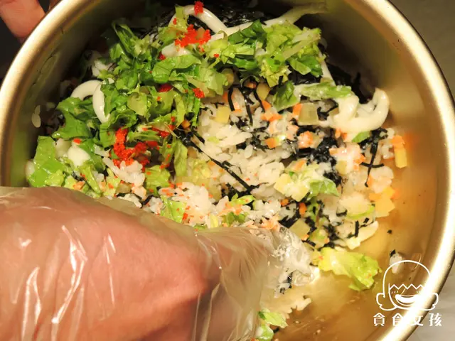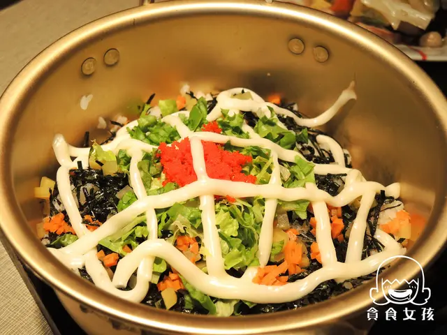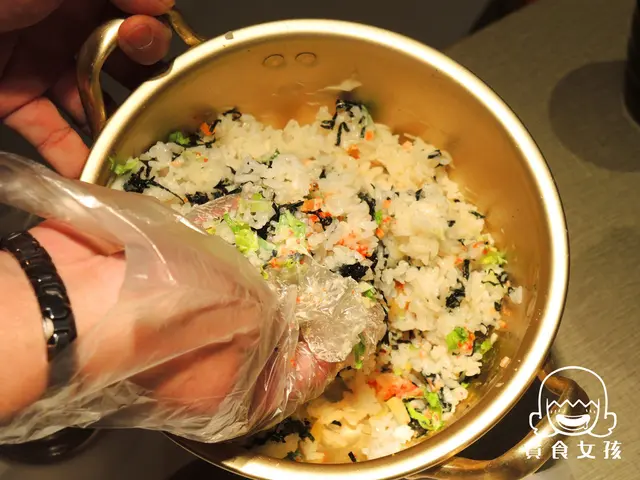 其實就是韓式拌飯,只是這款有多了些曖昧情愫~ 戴上手套一起和另一半先把鍋子內的食材攪拌均勻,然後再搓成一顆顆小飯糰,最後就是你餵我我餵你的 >< 整個份量可以5-6人分著吃。