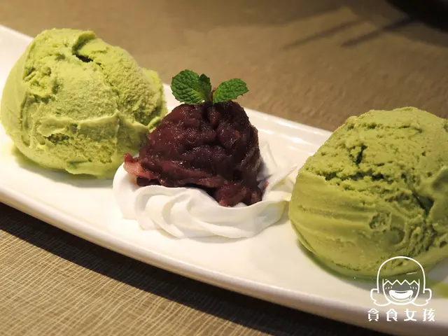 兩球抹茶冰淇淋,中間大配個紅豆泥,建議可以一口抹茶冰一口紅豆泥一起享用,紅豆的甜可以綜合抹茶些澀,這道表現中規中矩。