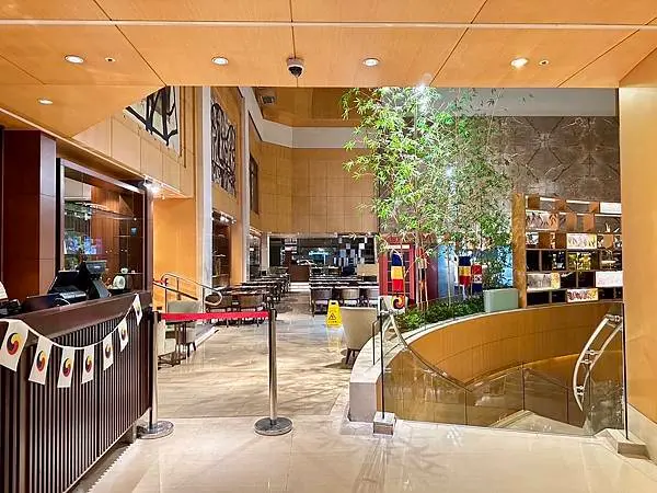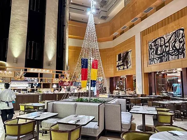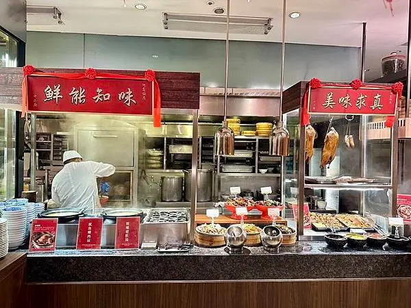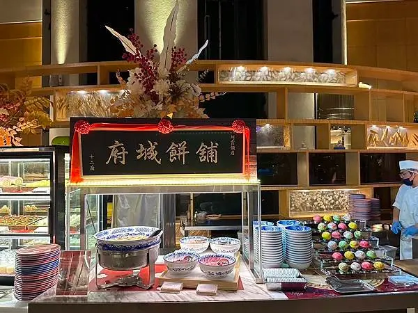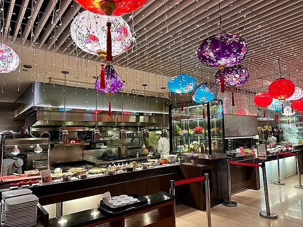 以12個開放式品項齊全的料理餐台區聞名,提供多樣化的國際美食。
