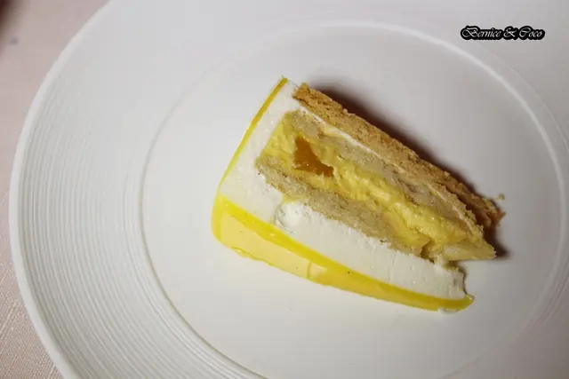 先是在杏仁塔殼內注入與少許萊姆皮所製成的椰子布丁,上層覆蓋一層主廚秘製的芒果醬