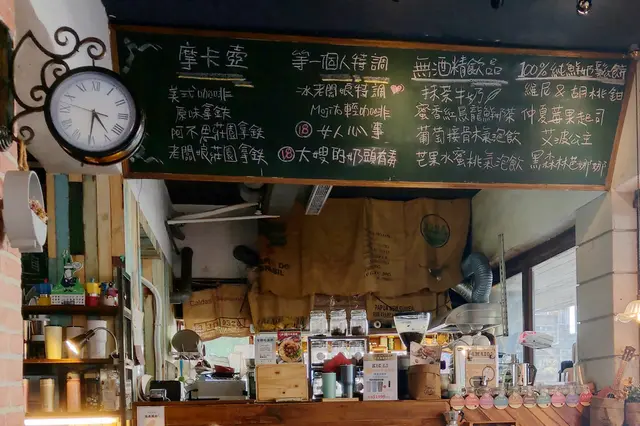 看起來有點凌亂卻很有味道的吧檯,上方還有手寫的飲品Menu Board。