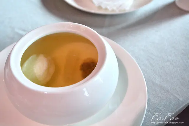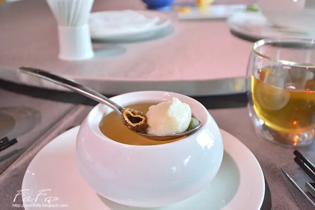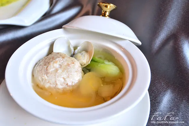 真菌燉芙蓉雞,裡頭藏在碗邊的白色丸子,特別之處就在內餡是包雞蓉,