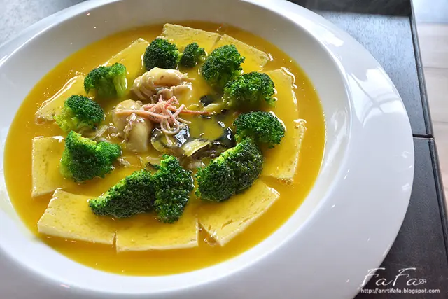譚祖庵豆腐魚腦,金黃色的濃縮高湯將青花菜印襯得更加翠綠,