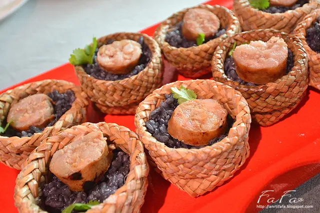 烏香飯軟糯偏濕有特別的草味及酸味,與香腸一起吃風味較能調適,
