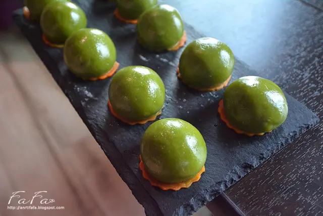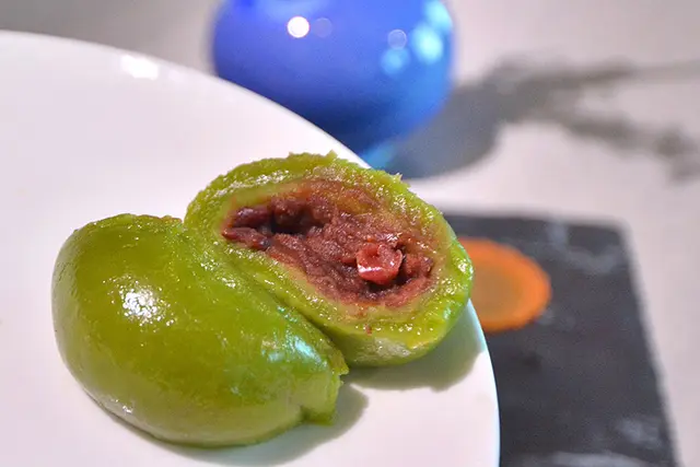 麻糬Q軟外皮是以天然的菠菜汁染色,顏色較自然,也有草汁味,