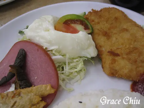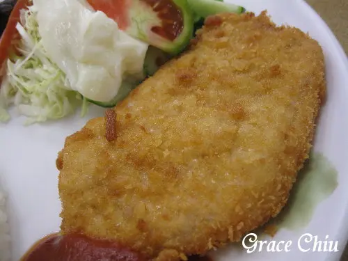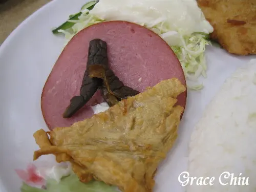 招牌快餐,飯.生菜沙拉.炸肉排.火腿.半片牛蒡天婦羅跟一點醬瓜,配料豐富,酥酥薄麵衣裡帶有些許肉汁的肉排炸的程度很剛好,生菜上附了厚實的一層美乃滋,除了生菜外,肉排.火腿.牛蒡天婦羅都很適合沾美乃滋吃.