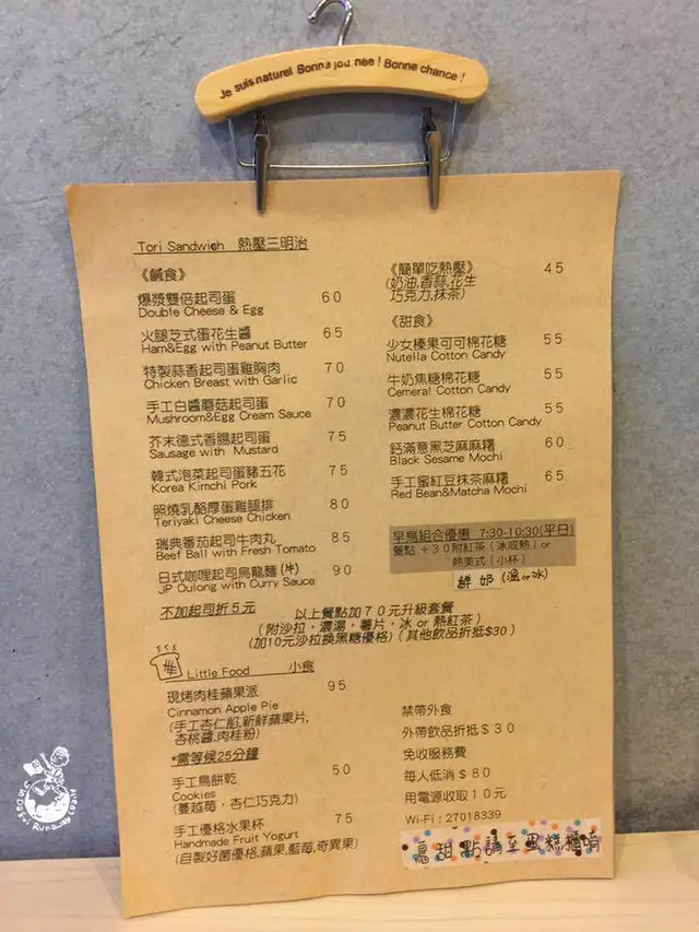 熱壓吐司上都會印有鳥的圖案,口味上除了花生,還有有奶油、香蒜、巧克力和抹茶。友人表示花生香氣濃郁,若能在滑順點會更好,鹹中帶點微甜,但不是死甜的那種。吐司軟硬度還好,比較軟軟的部分配上花生醬的口感還不錯。
