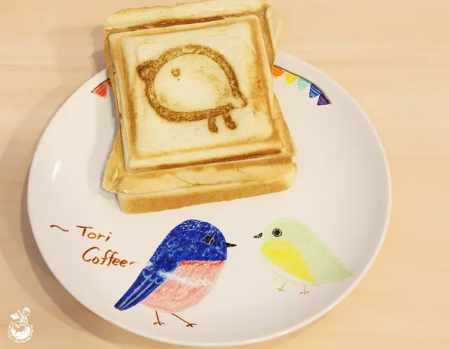 我的熱壓吐司上的鳥有點焦掉了,「鳥樣子」不是很清楚,幸好還有友人點的熱壓吐司可以借來拍沒有曬黑、完整版的鳥。