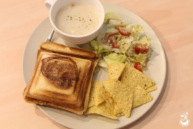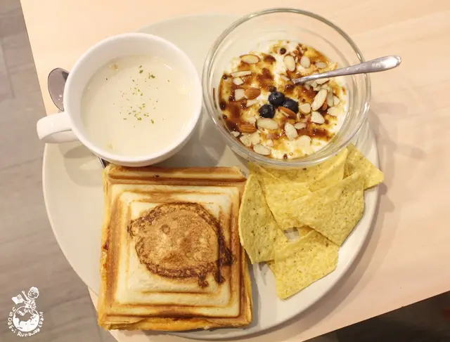 熱壓吐司都可以加$70升級套餐,有附沙拉、濃湯、薯片,飲料有冰或熱紅茶,而友人選擇加$10將沙拉換成黑糖優格,若想喝其他飲品可折$30。友人表示裡面的肉是培根火腿那種,不是她原先設想的豬肉片;起司的鹹味有綜合掉辣味,平衡的還滿好的;裡面還有水煮蛋,配上泡菜湯汁很加分,口感上較滑順。