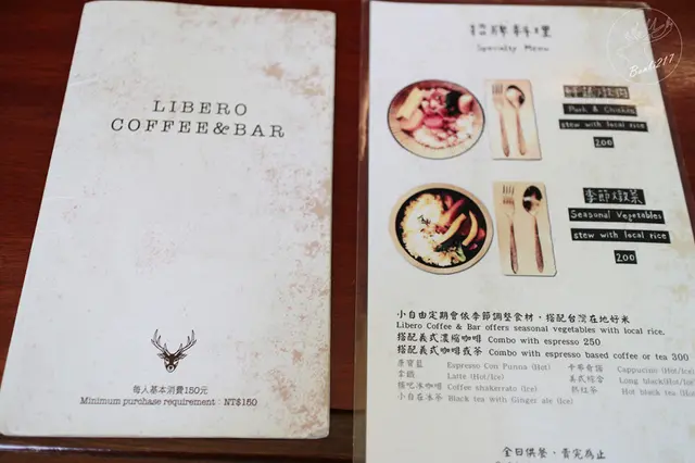 咖啡小自由菜單的正餐餐點是鮮蔬燉肉及季節蔬菜兩種招牌料理,單點為$200元,搭配義式濃縮咖啡為$250元,搭配義式咖啡(可選康寶藍、拿鐵、搖吧冰咖啡、卡布奇諾、美式綜合)或茶(熱紅茶、小字在冰茶)為$300元。