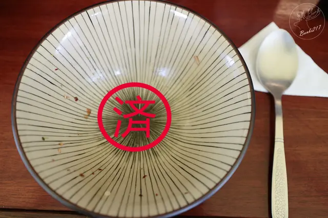 在日本節目「料理東西軍」常看到在料理時用完後打上的「済」字,此表示完成、結束,用於食用完的碗盤有完食之意,我也將此運用了一下,別有趣味。