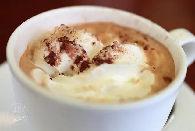 義式濃縮咖啡為底,鮮奶油在上。咖啡小自由的康寶藍接著在撒上點糖粒與巧克力粉。濃郁的熱義式咖啡香醇而尾勁帶點酸感,來點鮮奶油不僅溫度對比不同且也能增加滑順感,第一次嘗試康寶藍也留下了好印象。