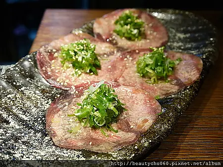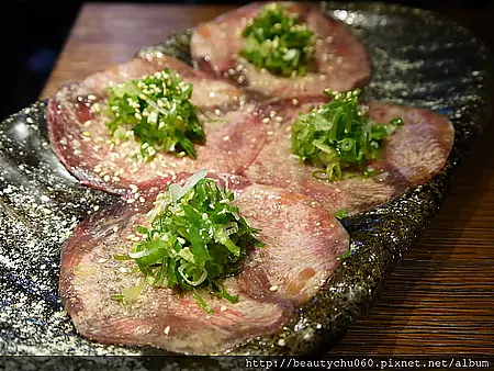 又薄又大片 灑上了椒鹽及白芝麻 每片牛舌加再上調過味的青蔥及洋蔥
