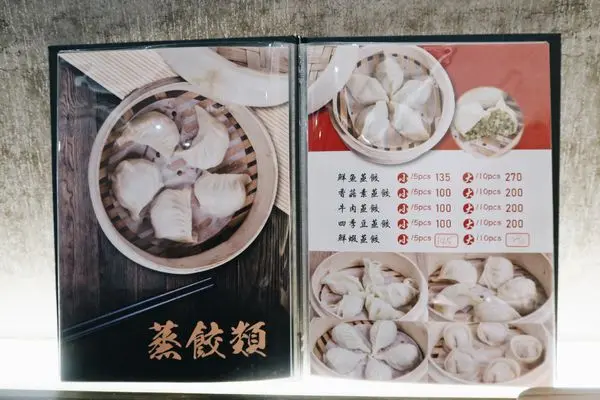 餐點分別有:蒸餃類、麵點類、火鍋類、開胃菜、主食、火鍋料、菜盤、甜點類、飲料。