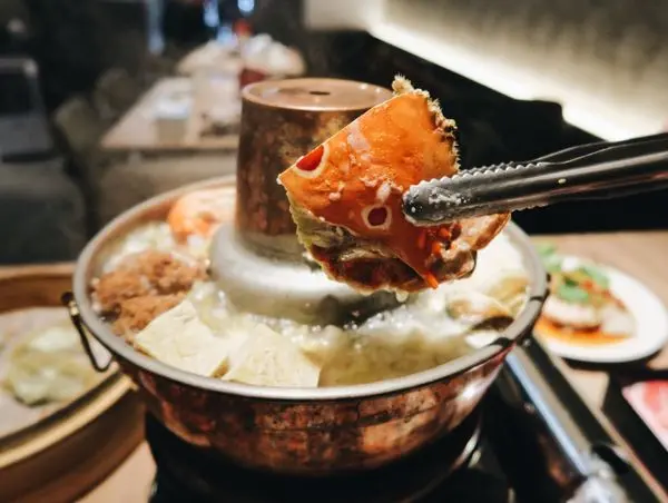 鍋裡有滿滿配料與海味, 鮮蝦、蚵子、蛤蠣、螃蟹、凍豆腐、手工豬肉丸、豆腐 ,用料非常豐富!