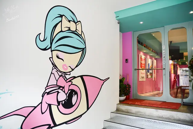 牆上彩繪著大大的Fantasy Diner 潮流美式餐廳LOGO吉祥物。