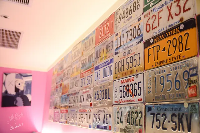 牆上貼著的是店家收集到的美國全部五十州的車牌,得知此不禁覺得店家好用心。