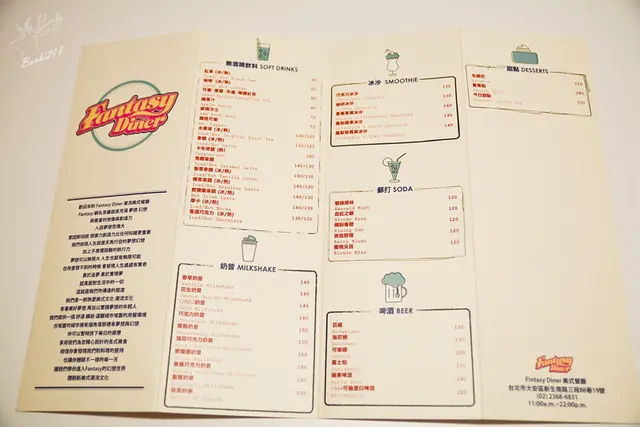 Fantasy Diner 潮流美式餐廳菜單:氣泡飲料、茶、咖啡、巧克力、奶昔、冰沙、蘇打、啤酒、甜點。