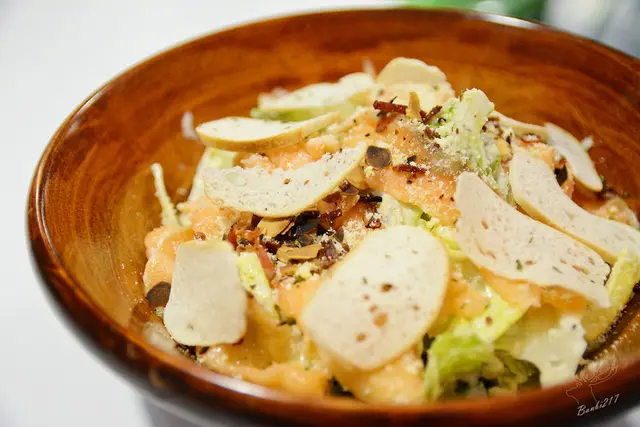 分量挺大的鮭魚凱薩沙拉有蘿蔓生菜、紅捲鬚、培根碎、煙燻鮭魚與薄脆麵包片,拌的凱薩沙拉醬鹹度與酸度上均適,整體中規中矩。
