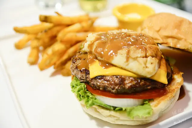 Fantasy Diner 潮流美式餐廳美式漢堡類除了牛肉外,還有雞肉及魚排堡類,我點了份經典的美式牛肉漢堡炭燒薯泥口味。漢堡麵包烤的微脆,接著是紅酒醬、一層綿密薯泥、起士片、牛肉漢堡肉、番茄片、洋蔥片與生菜,牛肉厚度剛好且軟嫩嚐的到肉的甜味,紅酒醬與薯泥搭配起來順口,一旁附贈的薯條則炸得酥脆且不油膩。