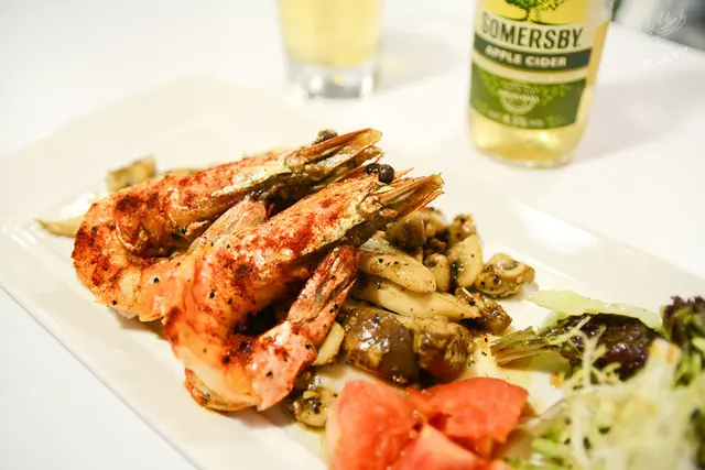 肉質緊實帶有Q度的大蝦上以紅椒粉增添香氣,下方以白酒和義大利香料炒的綜合菇類香氣很足夠且多汁,一旁搭配綠捲鬚、紅捲生菜與醃漬過的甜番茄。
