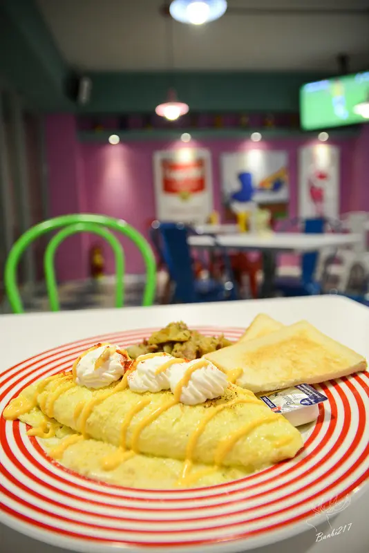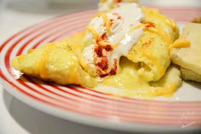 非常熱愛起司的朋友點了這道,有歐姆雷特(Omelette)、兩種起士醬、鮮奶油、香料炒馬鈴薯、吐司片與奶油。蓬鬆的厚蛋捲口感滑嫩,起司濃郁,味道整體中規中矩,不過這類濃郁起司類吃多本來容易會感到膩。