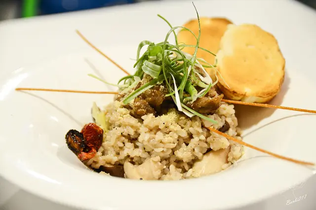 燉飯口感軟度適中,吃的到濃郁的菇類香氣,而燉飯附上了帶點鹹酸味的漬番茄乾能增添風味,上方鋪的骰子牛肉塊口感Q軟也不錯,另附了炸義大利麵以及麵包片,整體也中規中矩。