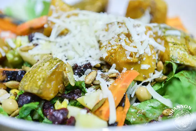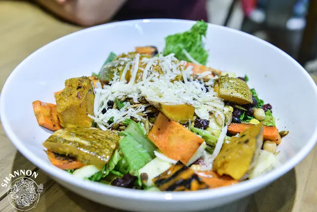 烤南瓜、烤紅蘿蔔、烤玉米、鷹嘴豆、蔓越莓乾、蘋果、焦糖胡桃或烤南瓜子、巴馬奶酪、黑醋芥末醬