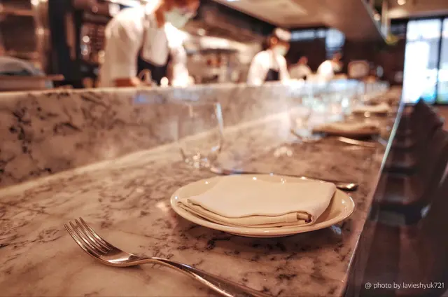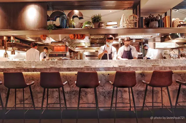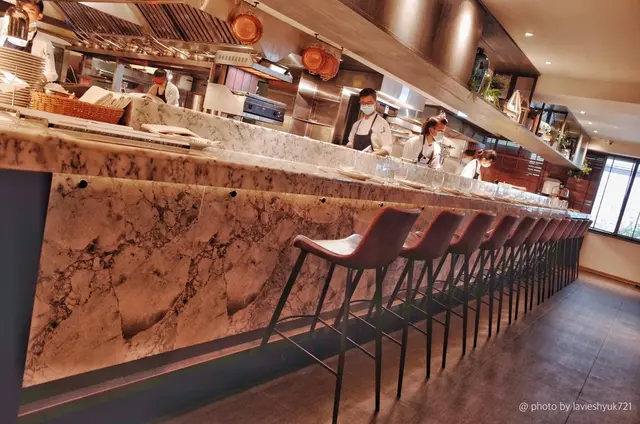 坐在吧檯高腳椅區無疑是種沉浸於色、香、味的近距離視覺饗宴,面對著乾淨俐落的大型開放式廚房,看著廚師們各司其職、專注認真的帥氣姿態,更增添對驚喜美味登場的期待感。